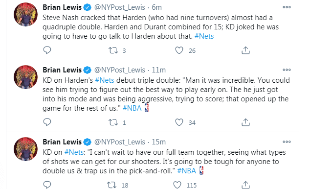 谈到哈登首秀就拿到三双数据,杜兰特称赞道:“兄弟,这是不可思议的。你可以看到他一直在试图用最好的方式打球。他进入自己的模式后,变得非常有侵略性,得分并为我们其他人创造机会。”