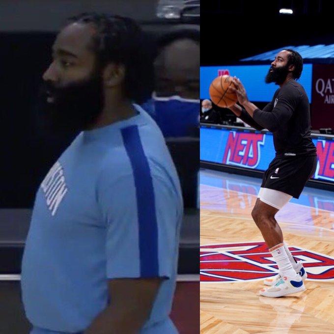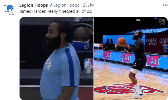 美媒《Legion Hoops》发推写道:哈登真是欺骗了所有人;NBA Buzz晒对比图并且写道:从火箭到篮网,哈登已经减掉很多体重。