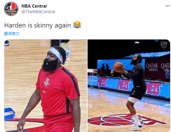 NBA Central晒另外一组对比照,写道:哈登又变苗条了。