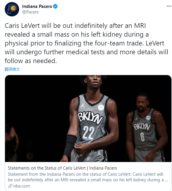 官宣!26岁新星无限期休战,篮网补偿步行者真因:左肾查出小肿块
