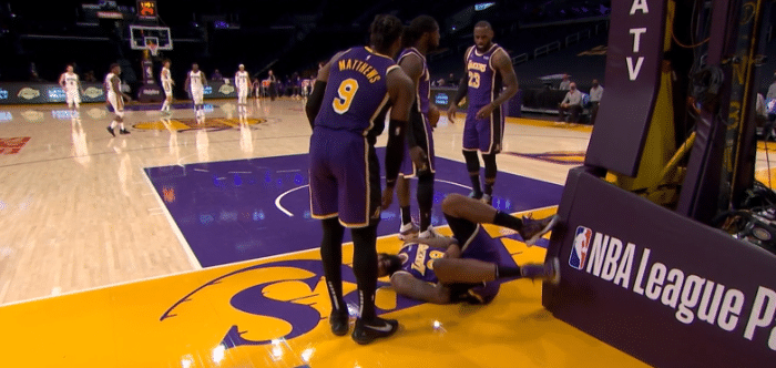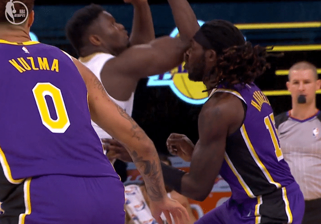 锡安铁肘太狠,湖人两大悍将惨遭肘击险受伤,大莫捂着肚子痛苦倒地