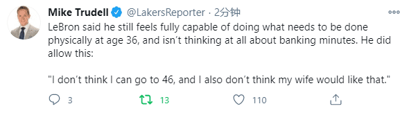 赛后谈到自己能达到多少岁?詹姆斯表示:我从26岁到36岁能保持出色的竞技状态,但我不会打到46岁,因为我的妻子也不想我打到46岁;詹姆斯表示不会打到46岁,原因是怕老婆生气,三旬老汉太有趣了。