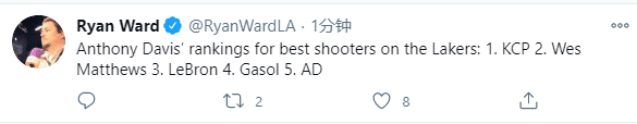 赛后浓眉调侃詹姆斯是队内第三射手,具体排名是波普第一,马修斯第二,詹姆斯第三,小加索尔第四和浓眉第五;此前湖人主帅沃格尔曾表示詹姆斯可能是队内最佳射手。