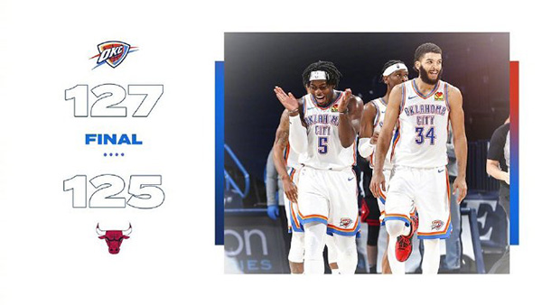 加时赛开打后,穆斯卡拉命中三分,肯里奇-威廉姆斯内线单打科比-怀特得手。雷霆关键时刻出现失误,科比-怀特打进三分。公牛没人防守穆斯卡拉,大空位的他再次命中三分。最终雷霆127-125击败公牛,迎来本赛季主场首胜。