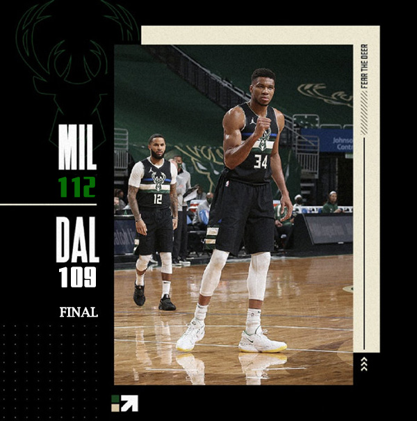 雄鹿112-109险胜独行侠 字母哥31+9 东契奇28+13+9