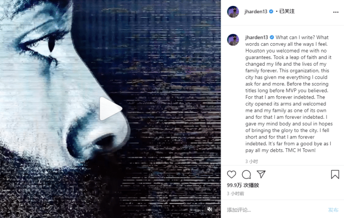 来源:直播车01-16 10:03直播车1月16日讯 火箭和篮网官宣大交易之后,哈登正式发表声明,不仅感谢火箭给了自己想要的一切,而且公开表示他还没有还清所有的债,永远亏欠着火箭和休斯敦;如今哈登已经抵达布鲁克林,并且作为篮网球员正式亮相,这也是哈登以篮网球员身份的首次亮相。