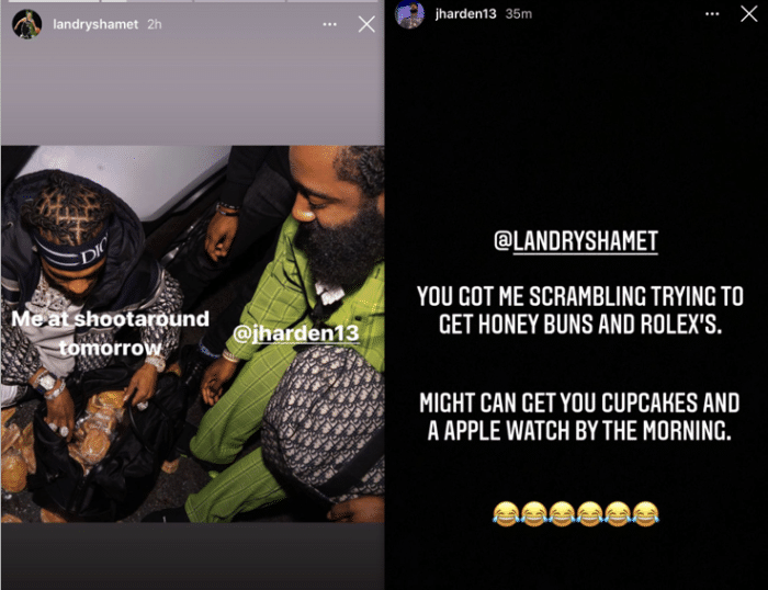 沙梅特晒出哈登送给好友生日礼物的合影,希望哈登明天能给自己一代蜂蜜面包和劳力士手表;对此哈登回应:你想要面包和劳力士,也许我会给你纸杯蛋糕和一块苹果手表(6个哭笑不得的表情)。