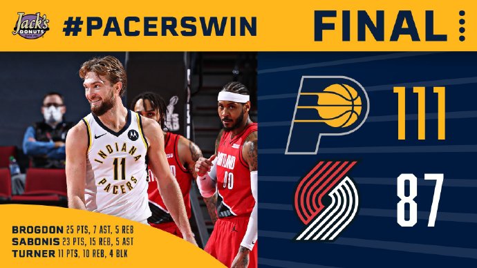 步行者111-87大胜开拓者 萨博尼斯23+15 布罗格登25+7