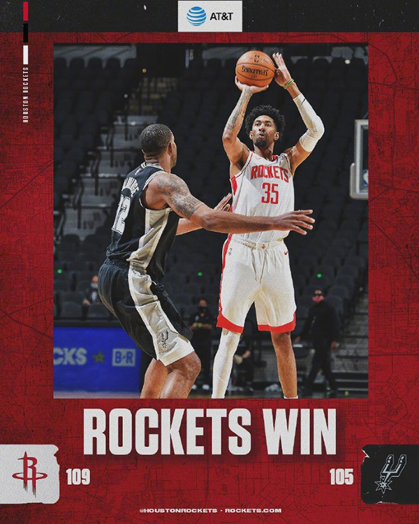 来源:直播车01-15 11:36 直播车讯:北京时间1月15日,2020-21赛季NBA常规赛继续进行,休斯顿火箭客场挑战圣安东尼奥马刺。全场打完,火箭109-105逆转马刺,止住两连败。