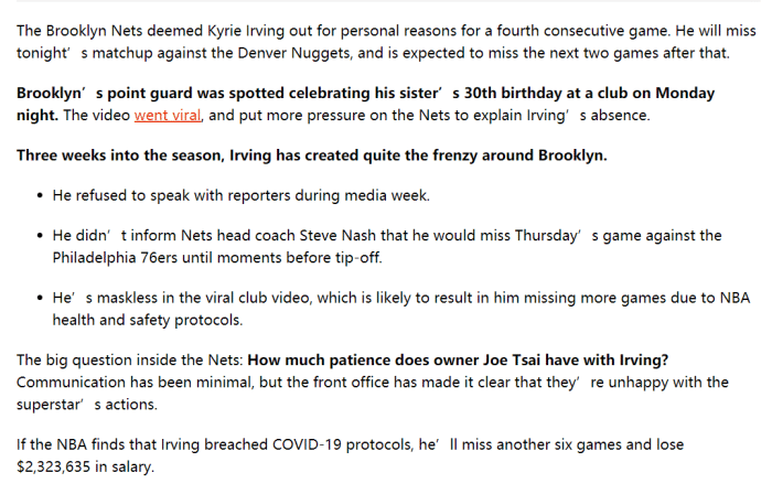 而球迷热议的篮网三巨头,目前最大的X因素就是欧文。欧文此前因为个人原因连续缺席比赛,而且毫无预兆地出现在了生日派对和律师会议上,这不但激怒了球迷,也让篮网高层非常失望。此前有报道称,篮网管理层对于欧文近期的举动非常不悦,双方的沟通已经降至冰点。而随后根据记者Puccio跟进报道,篮网老板蔡崇信已经逐渐对欧文失去耐心,双方的交流已经极少。