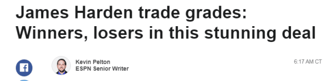 ESPN评级哈登四队大交易!火箭大赚获评A-,篮网组三巨头仅评D