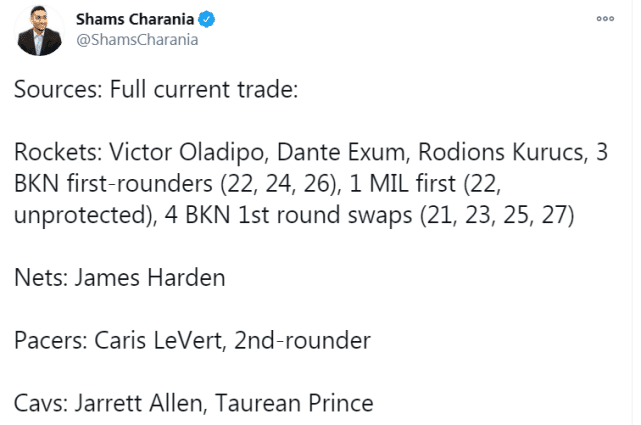 来源:直播车01-14 08:52直播车讯 北京时间1月14日,一笔关于哈登的四队大交易正式达成!篮网得到哈登,火箭得到奥拉迪波、埃克萨姆、库鲁茨、4个首轮和4次选秀互换权,步行者得到勒维尔和一个次轮签,骑士得到贾内特-阿伦和普林斯。