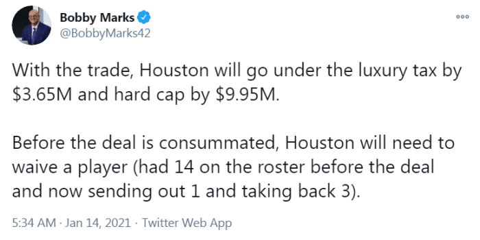 薪金专家鲍比-马克斯表示,通过这笔交易,火箭将薪金降到了奢侈税线以下365万美元,距离硬帽也有995万美元。火箭需要裁掉一名球员(交易前他们有14人,现在送走哈登,并换回3名球员)。