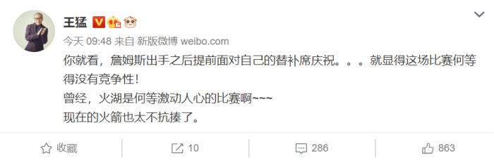 说回湖人这边,他们在第一节就基本上锁定了胜局,让王猛感慨“火箭太不抗揍了”詹眉都没怎么发力,上半场就统治了攻防两端,老詹甚至在比赛中投出三分球后自信转身,这个“装X三分”赛后也被热议。而浓眉则在一个攻守回合中完成大帽再完成篮下强行攻框,火箭真是拿他们没什么办法!