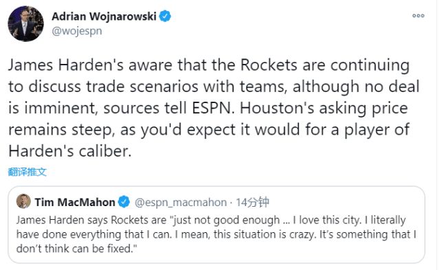 哈登在接受采访时表示:“我爱休斯敦这座城市,我真的已经竭尽所能了。但现在的情况很疯狂,我和球队的关系已不可修复了。”NBA名记麦克马洪评论道:哈登的这番话与公开要求被交易非常接近。不过名记WOJ表示,火箭在推进哈登的交易,但他们的要价依然很高,想要换回和哈登等量级的球员。