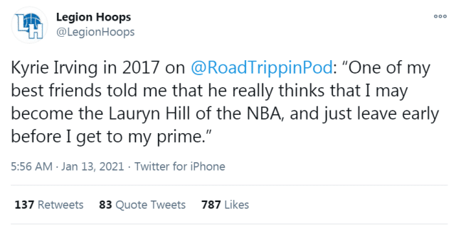 欧文在那段采访中说道:“我的一个最好的朋友告诉我,他真的认为我可能成为NBA版本的劳琳-希尔,在我的巅峰来临前就提前离开。”