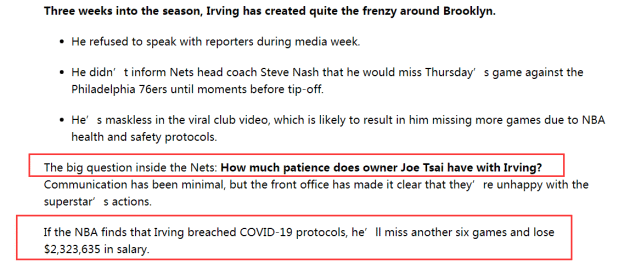Puccio指出,篮网内部的一个重要问题在于:蔡崇信老板对欧文还剩多少耐心?双方的交流太少了,而且高层的意思很明白,他们对这位超级球星的行为感到不满。Puccio还表示,如果欧文确定违反防疫规定,他将至少再缺席6场比赛,预计损失超过232万美元。