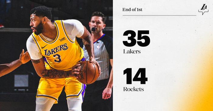詹姆斯下场后浓眉带队,湖人牢牢掌控局面,哈登再次惨遭大帽,湖人首节35-14足足领先21分之多。