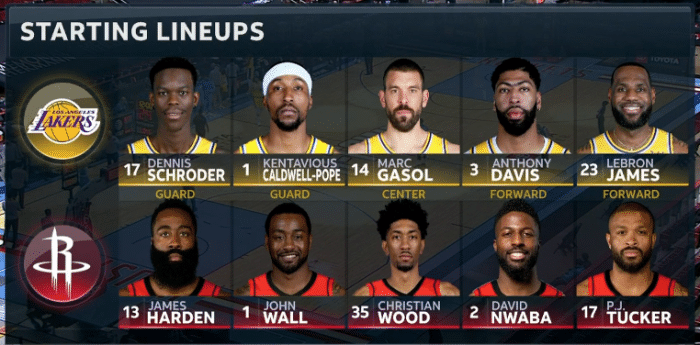 比赛开打后,小加索尔打进本场第一球,随后浓眉得分,詹姆斯抢到进攻篮板并且二次得分,伍德连得5分根本不足以抗衡湖人,詹姆斯助攻小加轰进三分球,紧接着詹姆斯外线出手也有,湖人开场5分钟打出18-10攻势直接打停火箭。