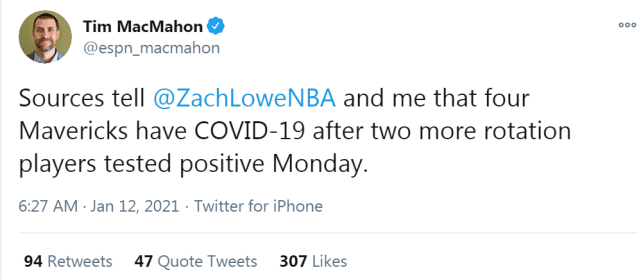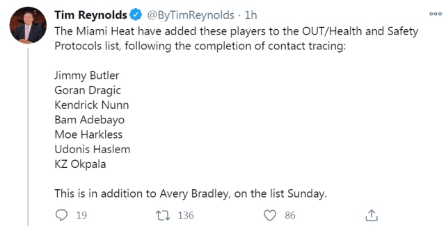 独行侠之前只有克莱伯一人检测呈阳性,但很快这一人数增至四人。独行侠已经关闭训练馆,他们未来的更多比赛预计被延期。热火将在13日客场对阵费城,他们因健康安全协议确定缺战的球员多达8人,包括巴特勒、德拉季奇、阿德巴约、布拉德利、纳恩、哈克莱斯、哈斯勒姆和KZ-奥克帕拉,这些球员预计将接受隔离。