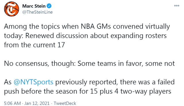 另外,名记马克-斯坦恩还报道称,联盟预计还会重新开启关于扩展名单的讨论,赛季前,曾有关于名单变成15+4(4份双向合同)的讨论,但没有获得通过。