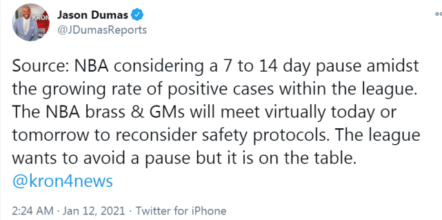 来源:直播车01-12 14:45直播车1月12日讯 过去几天,NBA正在面临越来越大的压力。北京时间1月12日,据美媒报道,独行侠已有4名球员新冠检测结果呈阳性,而热火队又有8名球员进入健康安全协议的隔离。越来越多的球队面临凑不够8名球员比赛的可能,联盟已经官宣,鹈鹕vs独行侠的比赛和凯尔特人vs公牛的比赛已经正式延期。