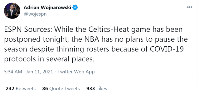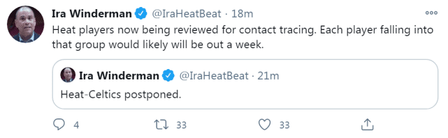 根据报道,一名热火球员的检测结果存在不确定性,根据联盟的健康安全协议,球队不具备能参加比赛的最少人数。随后,热火跟队记者温德曼报道称,每一位涉及的球员都很可能因此被隔离至少七天。