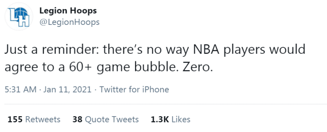 曾有人建议联盟重新考虑回到园区打比赛,但很快有美媒表示,让NBA球员进入园区打60场以上的常规赛,是不切实际的,没有人会愿意接受这样的提议。