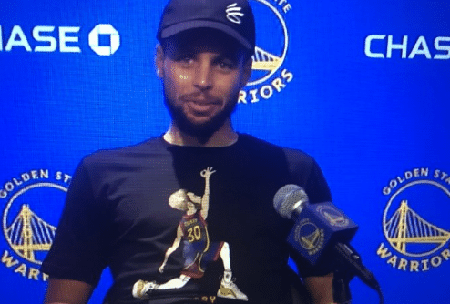同时库里参加新闻发布会时候穿的T恤火了,不少网友甚至是媒体人都在网络上求,希望可以得到这样一件相同的T恤。库里穿的衣服上是自己的卡通形象,穿着勇士30号战袍的卡通萌神单膝跪地,手做出了经典的三分球庆祝动作,非常的可爱。