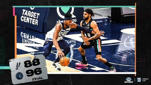 来源:直播车01-11 11:38 直播车讯:北京时间1月11日消息 NBA常规赛继续进行,马刺与森林狼迎来背靠背的第二场较量。此役两队当家球星德罗赞和唐斯都没有出战。森林狼阵中拉塞尔和比斯利双核驱动,两人双双砍下20+得分,率领森林狼主场96-88险胜马刺,成功复仇。