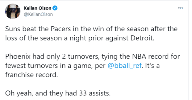 全场比赛,太阳只出现了2次失误。事实上,进入到最后一节还剩下3分钟时,太阳只有卡梅伦·约翰逊一个人出现了1次失误,保罗随后增加了1次失误。在NBA常规赛历史上,还从未出现了全队单场1次失误的比赛。而2次失误,也让太阳创下队史纪录,并追平NBA的历史最低单场失误数。上一次单场2失误的,是2017年黄蜂在对阵雄鹿做出的,不过当时黄蜂输掉了比赛。
