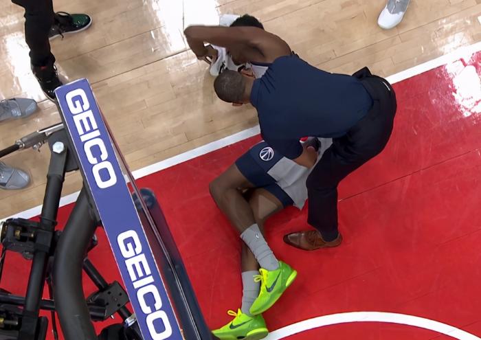 托马斯-布莱恩特捂着自己左腿大腿内侧,随后给出的慢镜头显示,托马斯-布莱恩特在争抢篮板落地的时候先是遭遇到了90度的崴脚,随后又伤到了左膝,倒在地上的托马斯-布莱恩特久久没有起来,在缓了很长时间以后,他在工作人员的帮助下站了起来,随后他想自己走回更衣室,但是左腿已经无法承重,最终他被两名工作人员直接架回了更衣室。