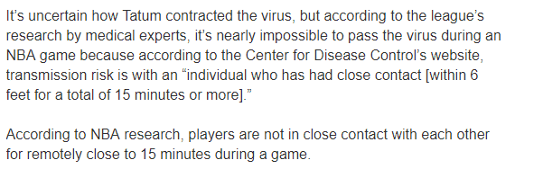 凯尔特人记者Gary Washburn透露了联盟关于“密切接触者”的判定标准——在6英尺内(约1.83米)接触15分钟或以上;联盟的医学专家认为,病毒几乎不可能在比赛中进行传播,因为根据NBA研究,在一场比赛中,球员之间的近距离接触不会超过15分钟。