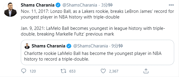 20年探花三球正式成为NBA历史最年轻三双先生,与此同时名记shams发推写道:2017年11月,湖人新秀郎佐-鲍尔超越詹姆斯成为历史最年轻三双球员;如今三球超越富尔茨成为新的最年轻三双球员,鲍尔兄弟都是超越状元创造历史,球爹又可以疯狂吹牛了。