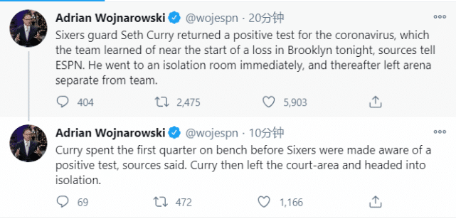 根据赛前的报道,小库里是因为左脚踝酸痛缺席比赛。当时或许小库里本人也不知道,他的检测结果会呈现阳性。因此,他还是坐上了板凳席。但世事难料,随后球队给出了阳性的检测结果,小库里随后被隔离,而费城全队也将被隔离。