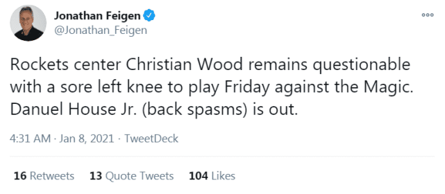 来源:直播车01-08 09:54直播车北京时间1月8日讯,火箭官方更新了球队的最新伤情。缺席对步行者一战的豪斯和伍德,依然在球队的伤病名单上。豪斯由于背部痉挛,将继续缺席主场对魔术的比赛,而伍德(左膝酸痛)是出战成疑(questionable,50%上场可能)的状态。