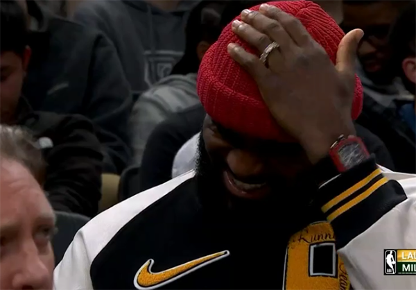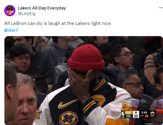 詹姆斯因伤缺战,湖人开场被雄鹿打爆了,10-29开局落后到19分,第一节3分48秒,波蒂斯执行罚球时镜头给到湖人替补席,詹姆斯戴着小红帽、坐着替补席捂脸大笑引热议,王猛调侃老詹捂眼都不愿意看了,估计谁给他说了一个笑话。