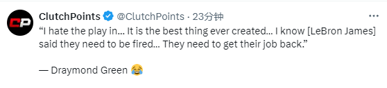 在自己的播客节目中谈到附加赛,追梦格林表示:我讨厌附加赛,正如你所知,我真的很讨厌附加赛。但附加赛也是有史以来最牛逼的东西,当你期待着附加赛会发生什么篮球故事时,它就成为了有史以来最牛逼的东西。我知道詹姆斯说过,发明附加赛的人应该被解雇,他们应该回到原本的工作上去。但是附加赛真的太疯狂了,自从NBA加入了附加赛规则,它把NBA最后一个月,甚至半个赛季的热度提升到了一个新的水平,完全不同的水平。所以,我非常讨厌附加赛,我很讨厌成为10号种子。但就算我这么讨厌它,对于一个篮球运动员,对于一个篮球迷来说,附加赛的疯狂太令人着迷了,你应该去享受它。