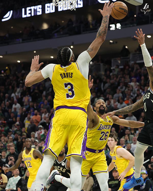 詹姆斯因伤缺战,湖人在两次落后19分的情况下疯狂反扑,末节湖人27-13扳平比分,关键时刻浓眉和里夫斯连中三分;第一个加时赛浓眉和里夫斯继续输送三分,利拉德关键三分,拉塞尔两罚全中,浓眉盖帽把比赛拖进双加时,两队明显都累了,里夫斯率先得分以及轰进制胜三分,字母两罚不中,浓眉两罚全中杀死比赛,最终湖人双加时128-124险胜逆转雄鹿。