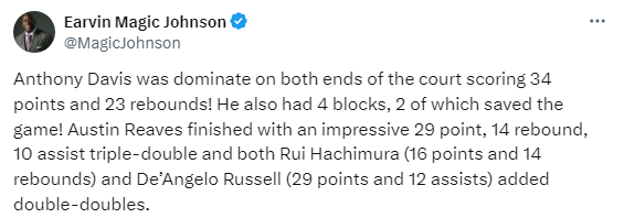 湖人名宿魔术师发推写道:浓眉统治攻防,拿下34分23篮板,还有4次盖帽,两次拯救了比赛;里夫斯29分14篮板10助攻令人印象深刻,八村垒16分14篮板和拉塞尔29分12助攻,都贡献了两双。