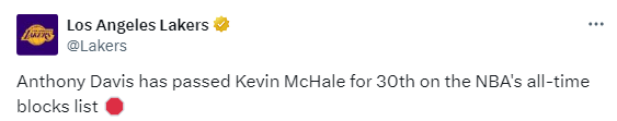 5、浓眉生涯盖帽数达到1691个,超越凯文-麦克海尔(1690),升至历史第30位