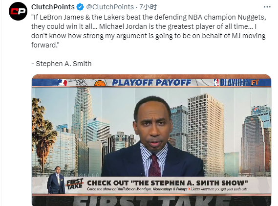 湖人挑战卫冕冠军的系列赛备受关注,名嘴A-史密斯表示:如果詹姆斯和湖人能击败卫冕冠军掘金队,他们就能赢得总冠军,乔丹是有史以来最伟大的球员,若詹姆斯带队击败掘金并且再次夺冠,我不知道我还能怎样为乔丹辩护。