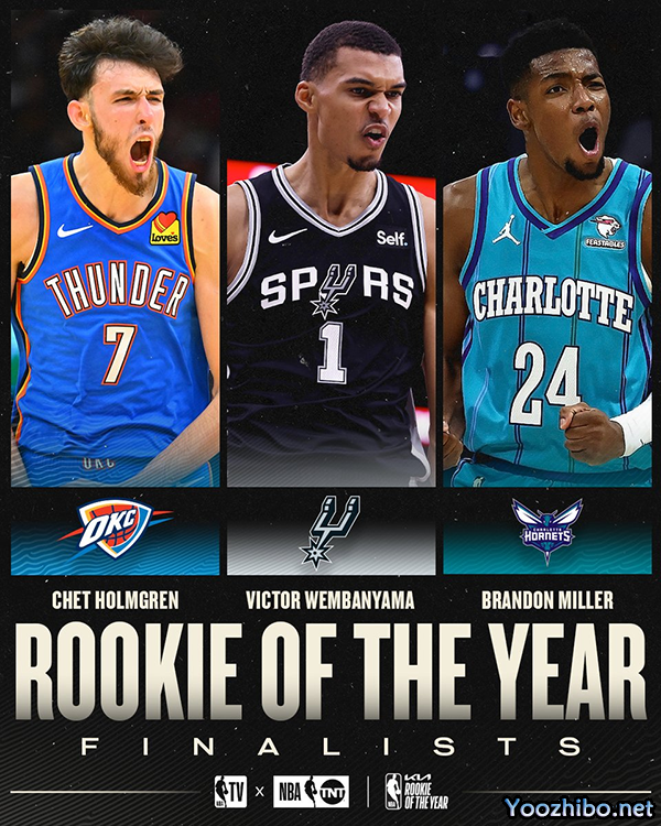 文班亚马出战71场,场均21.4分10.6篮板3.9助攻3.6盖帽,1月、2月和3月都是西部月最佳新秀,外界普遍认为他已经锁定这一奖项。霍姆格伦打满82场,场均16.5分7.9篮板2.4助攻2.3盖帽,是11月和12月的西部月最佳新秀。布兰登-米勒出战74场,场均17.3分4.3篮板2.4助攻,他是1月、2月和3月的东部月最佳新秀。