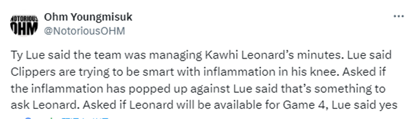 小卡仅仅上场25分钟,7中4仅仅拿到9分9篮板,为何上场时间这么少?赛后泰伦-路表示球队正在管理小卡的上场时间,球队正在努力处理他的膝盖发炎问题,卢帅还表示预计小卡会出战G4。