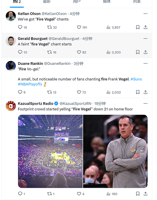 来源:直播车04-27 15:15直播车讯 北京时间4月27日,系列赛G3回到主场,太阳109-125又被森林狼打爆了,杜兰特绝望离场,太阳球迷高呼沃格尔下课。