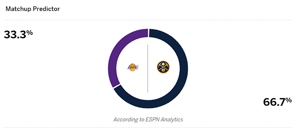 根据赛程,湖人和掘金G5将在明天上午10点开打,湖人大比分1-3落后掘金,ESPN预测G5胜率——湖人仅为33.1%,掘金胜率高达66.9%;换言之,美媒看好掘金拿下G5,也就是看好掘金主场4-1淘汰湖人。