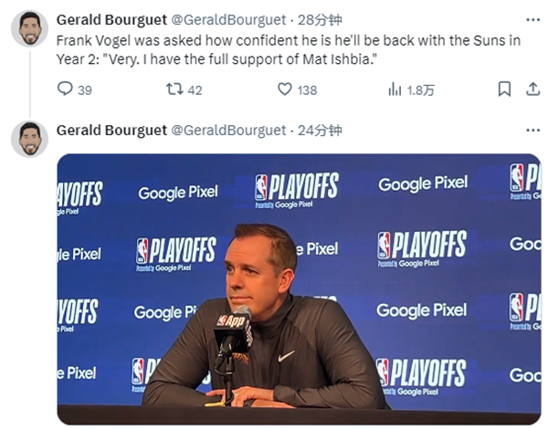 沃格尔会被解雇吗?G4赛前,太阳主帅正面回应下课流言,直言:非常有信心下赛季继续执教太阳,我得到了马特-伊什比亚的全力支持。