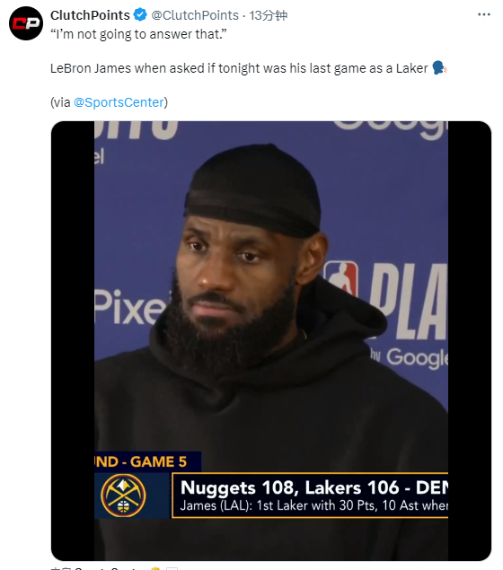 当被问到这是否是自己作为湖人球员的最后一场比赛时,詹姆斯表示:我不会回答这问题,谢谢!