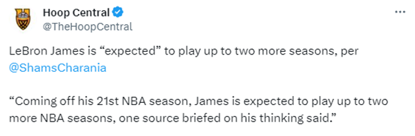 据Shams报道,一位了解詹姆斯想法的消息人士称,在结束了他的第21个NBA赛季后,詹姆斯预计还会再打两个NBA赛季,他在2024-25赛季拥有5140万美元的球员选项,再过两个赛季,詹姆斯将在洛杉矶度过2026年全明星周末。