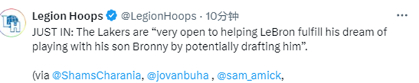 Shams还表示,湖人很愿意帮助詹姆斯完成父子同台的愿望,通过直接选中布朗尼的方式;今年湖人拥有首轮17顺位(鹈鹕拥有优先互换权)以及次轮总第55顺位(来自快船)的签位。